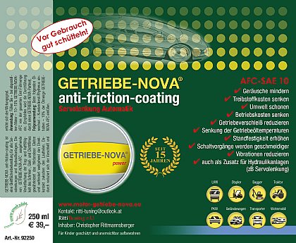 GETRIEBE-NOVA anti-friction-coating ist eine Gleitflächenbehandlung für alle Servolenkungen und Hydraulikanlagen. Die von GETRIEBE-NOVA-AFC ausgehende Vervielfachung der Trag- und Haftfähigkeit des Schmier-, Gleit- und Dichtfilmes gewährleistet das friktionslose Gleiten und verhindert weitgehend den Direktkontakt zwischen den Laufteilen. Dadurch reduziert sich der Verschleiß und erhöht sich der Wirkungsgrad.
